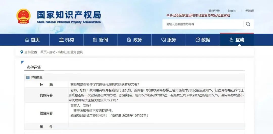 从这条回复中我们可以看到,答辩通知书已不发送抄送件。也就是说商标局只按照商标地址去邮寄挂号信,若商标注册地址接收不到挂号信,那就可能错过答辩的机会,历尽千辛万苦争取到的商标就不属于你了。(挂号信是不会打电话的,只会按照地址派送,无人接收就退回了)