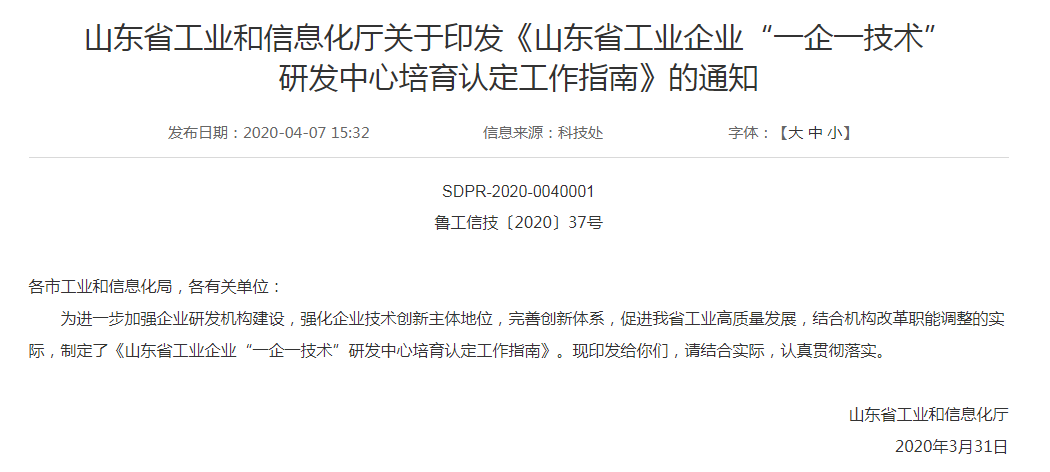 山东省工业企业“一企一技术”研发中心培育认定工作指南